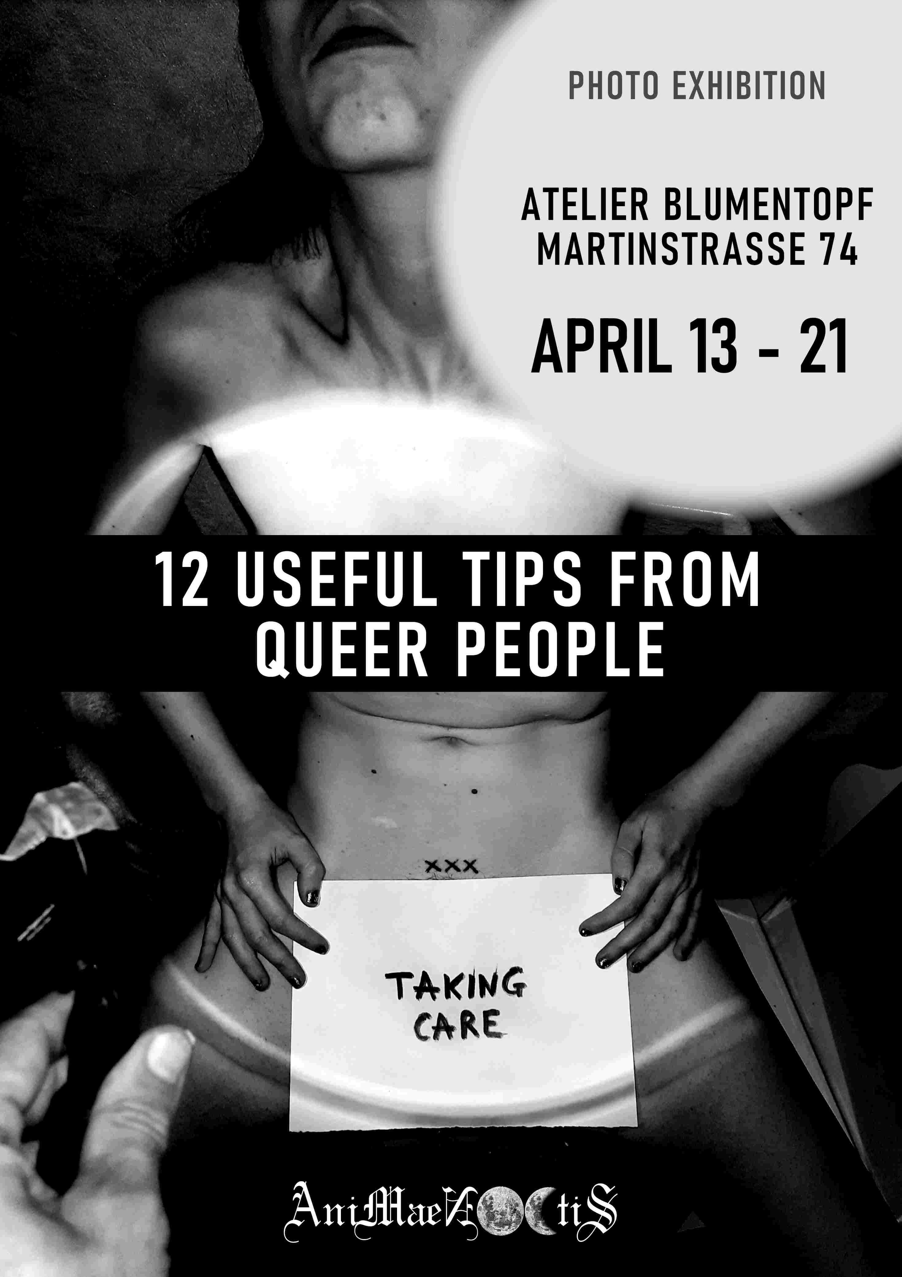 Silvia is sitting on a chair. It's a cold night in Budva, Montenegro. She holds 12 cartels with life tips from her personal experience: no authority, but pure life practice. The photographer is her husband Massimo. He enters some pictures with his very presence and/or a peculiar rainbow light. Both Silvia and Massimo live on their physical/erotic art. Both of them have the Rebis tattoo on their backs: the union of Man and Woman. Which means their own union and their personal inner essence. Both of them live in Serbia after fleeing Italy and they roam a lot. They make art with everything they deal with.